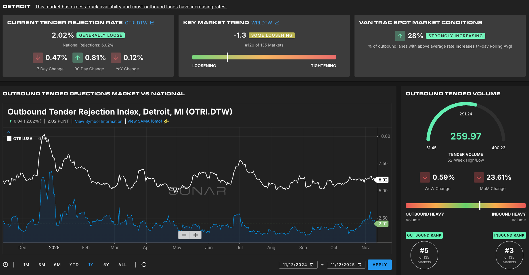 Spot rates in Detroit are under the national average, at 2.02% compared to the national average 6.02% which is great for shippers looking for strong contract carrier compliance, but not ideal for carriers.