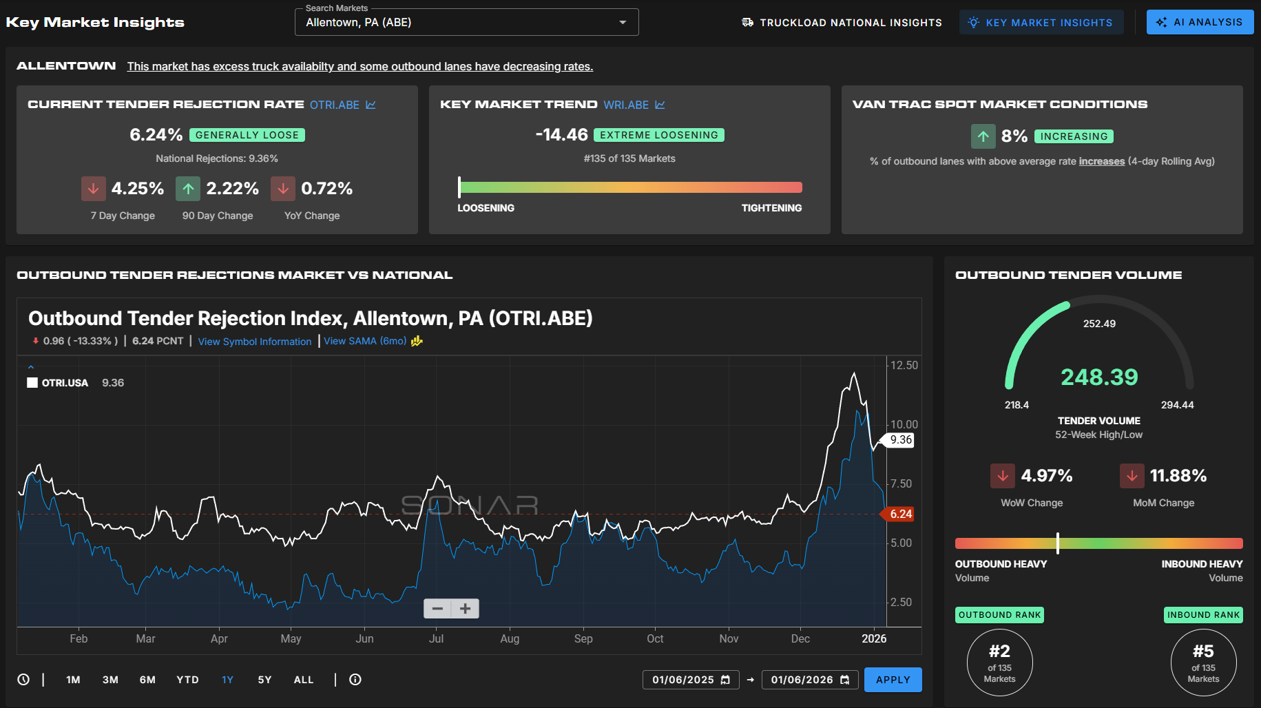 Allentown’s outbound tender rejection rates continued to fall in the past week, dropping 425 basis points from 10.49% on Dec. 29 to 6.24%.