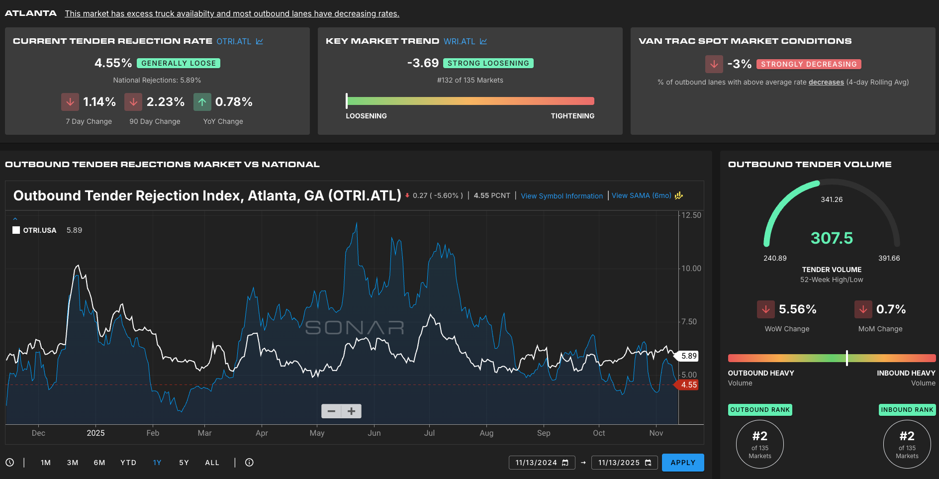 Atlanta has remained a relatively stable market for a majority of the year, but in the past month or so has started to see some changes in outbound tender rejections falling below the national average.