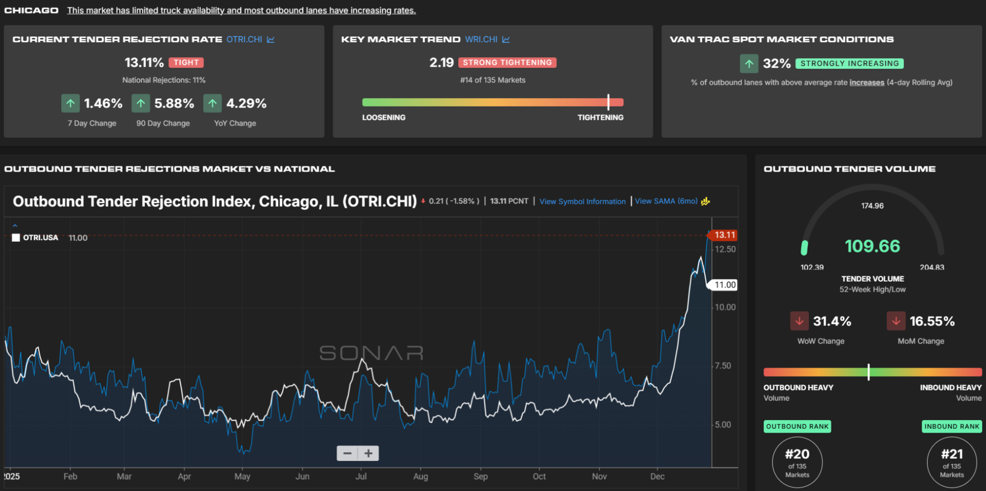 The Chicago outbound tender rejection rate rose alongside the national tender rejection rate during the holiday period and now, at 13.1%, exceeds the national rate by 211 basis points.