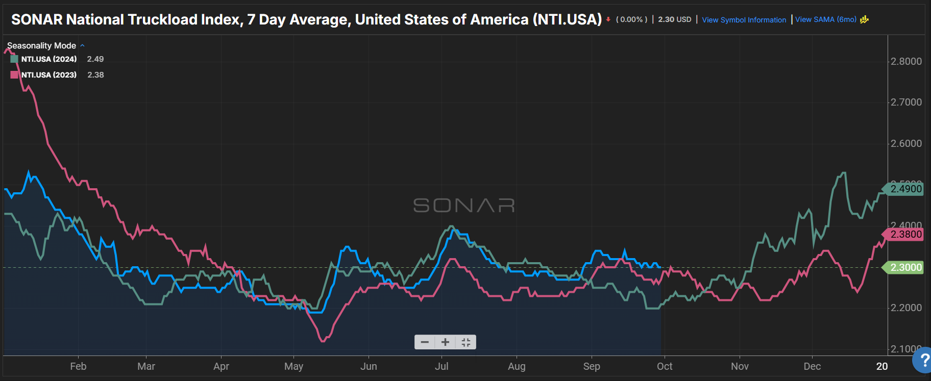 Summary: Dry van spot rates saw a slight decline during the last week of September. Despite the decline, the SONAR National Truckload Index 7-Day Average remains higher than it was during the same period in the last two years. The NTI fell 1 cent per mile all-in week-over-week from $2.31 on Sept. 22 to $2.30. Compared to last year, the NTI is 9 cents per mile higher than $2.21 and 3 cents per mile higher than $2.27 in 2023.