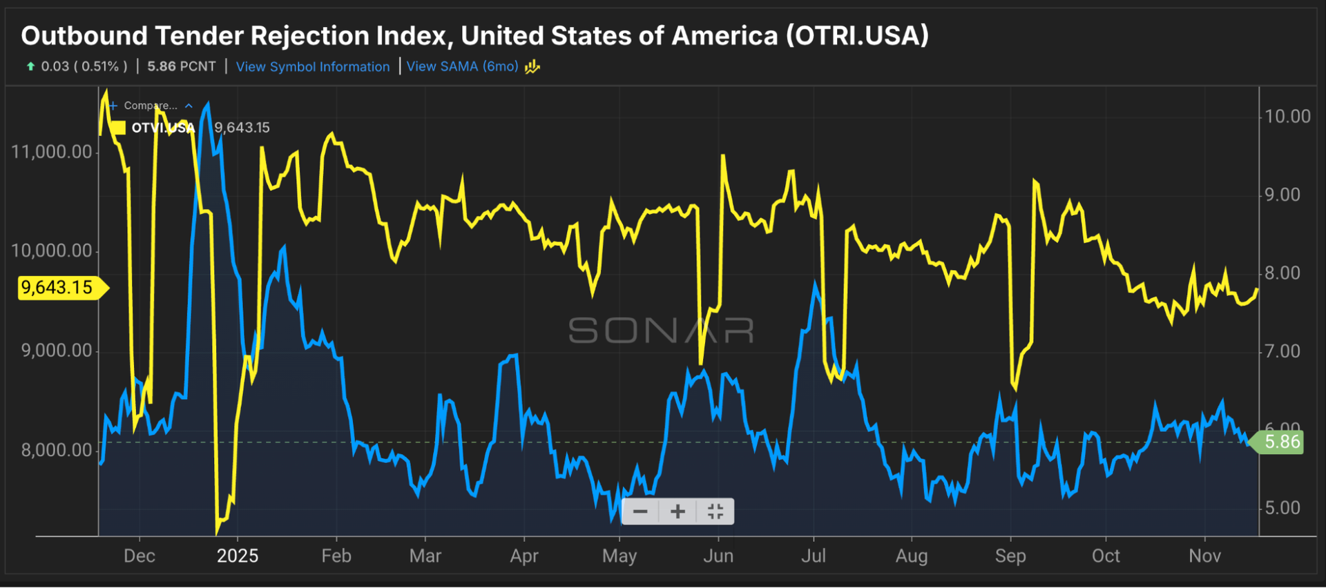 Outbound tender volumes posted gains but remain depressed compared to 2024. OTVI rose 56 points or less than half a percent week over week from 9,587.15 points to 9,643.15 points. Compared to last year, OTVI is 1,530.77 points or 13.7% lower than 11,173.92 points.