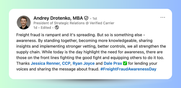 Freight fraud continues to surge—but so does awareness. Verified Carrier’s Andrey Drotenko thanked leaders recently for talking about the issue, sharing insights, and improving controls. Still, we have to ask: Is an awareness day enough to curb the problem? What steps did you or your company take to make others aware?