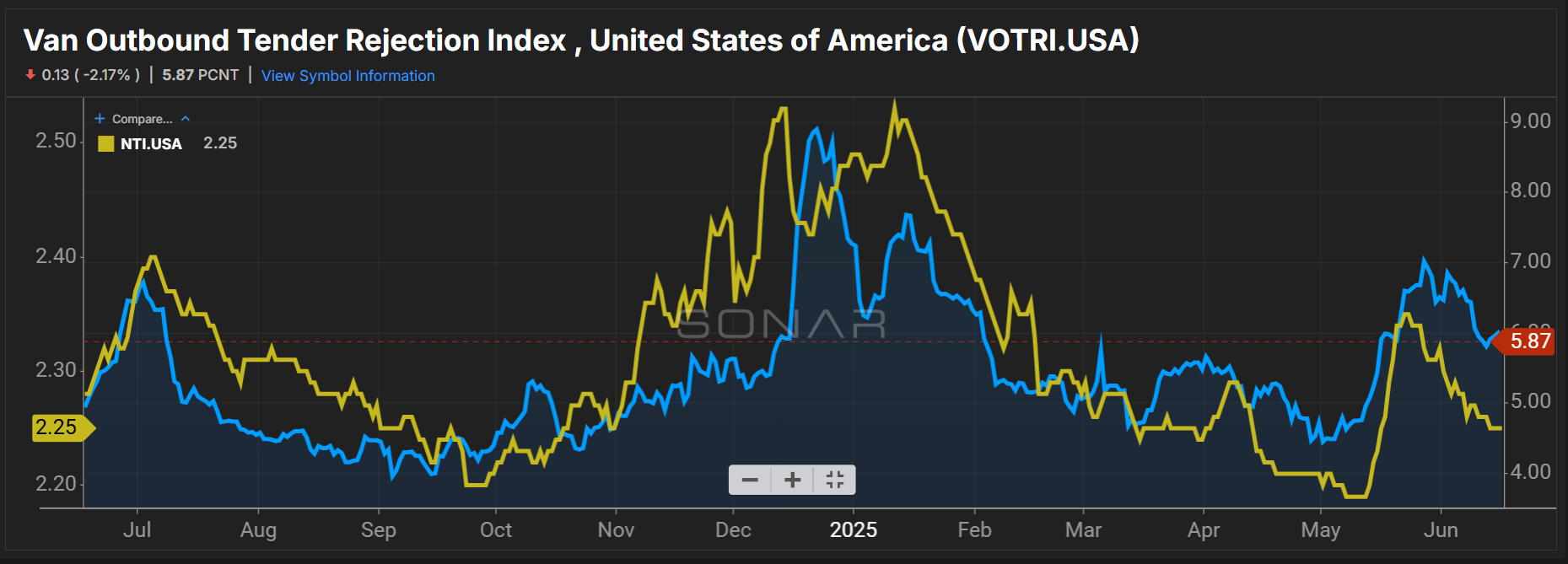 Spot market rates also saw declines, and are trending lower compared to last year. The SONAR National Truckload Index 7-Day Average fell 2 cents per mile all-in from $2.27 on June 9 to $2.25 per mile. This is 3 cents per mile lower than last year, when NTI was at $2.28 per mile on June 17, 2024.